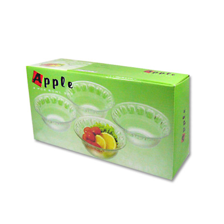 4 pc Bowl SetINNER (PCS): 4MST (SETS): 24N.W (KGS): 0.11G.W (KGS): 3.00CBM (M3): 0.057EAN-13: 8 993373 258517